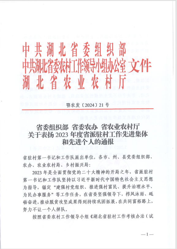同時,省農業(yè)農村廳印發(fā)的省委組織部、省委農辦、省農業(yè)農村廳《關于表揚2023年度省派駐村工作先進集體和先進個人的通報》(鄂農發(fā)[2024]21號),湖北清能投資發(fā)展集團有限公司榮獲“2023年度工作突出派出單位”。